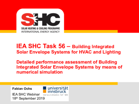 The IEA SHC Task 56 focuses on the critical analysis, simulation, laboratory test and onsite monitoring of envelope systems entailing elements that use and/or control incident solar energy which aim to deliver renewable thermal or/and electric energy to the systems providing heating, cooling and ventilation to buildings and/or which aim to reduce heating and cooling demands of buildings, while controlling daylight.