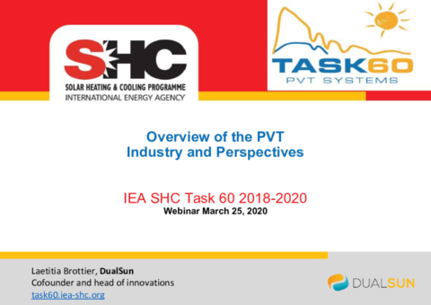 Over the past few years, PVT systems that combine solar thermal technology and solar PV have gained more attention. In 2018, IEA SHC started the Task 60 called “PVT systems” to better understand the applications of the technology. PVT solutions can be used in several ways which Task 60 is currently investigating with heating or cooling for residential, commercial, administrative or industrial buildings as the main application. This webinar will introduce the current status of PVT technologies, show examples of systems, analyze the markets and trends, talk about the key findings of Task 60 and open new horizons.