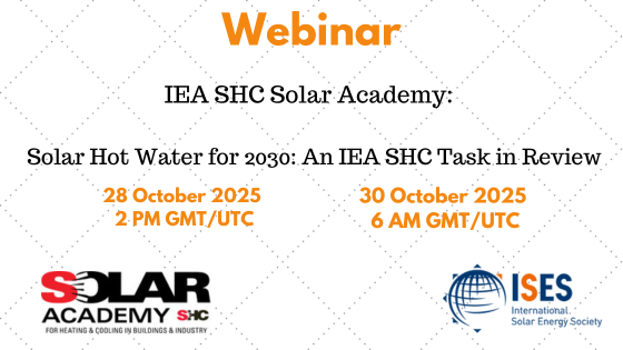 ISES and the IEA SHC Solar Academy are happy to announce that this webinar will be held twice, first on 28 October at 2 PM GMT/UTC and again on 30 October at 6 AM GMT/UTC to accommodate our global audience, especially from Australia and Asia.