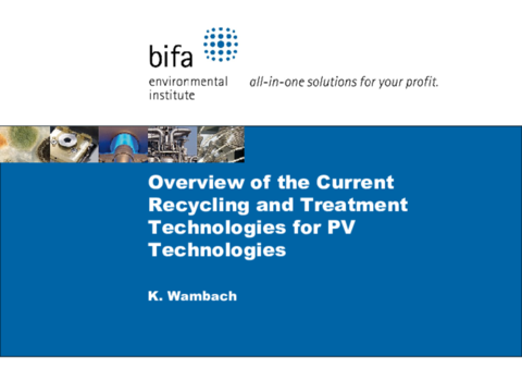 As a pioneer of PV module take back and recycling of PV modules and industrial refining of silicon, Karsten Wambach holds more than 30 years of experience in different sectors of photovoltaics und environmental technologies at Bayer, Pilkington, SolarWorld, Wambach-Consulting and bifa Umweltinstitut. In his work, he focusses on circular economy, classification of wastes and their valorisation. Mr Wambach also is involved internationally in projects and associations such as EPIA, BSW, PV CYCLE, IEA PVPS Task 12 and in conferences. He is the Initiator, co-founder and first President of PVCYCLE Association (2007 -2011) as well as Member of Scientific Organisation Committee of EUPVSEC (sustainability and recycling of PV).